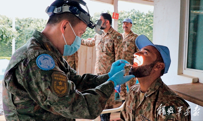 我維和醫(yī)療分隊開展巡診活動。圖為中國軍醫(yī)(左)為巴拉卡分遣點的巴基斯坦軍人進(jìn)行口腔檢查。(攝影/楊巧巧)