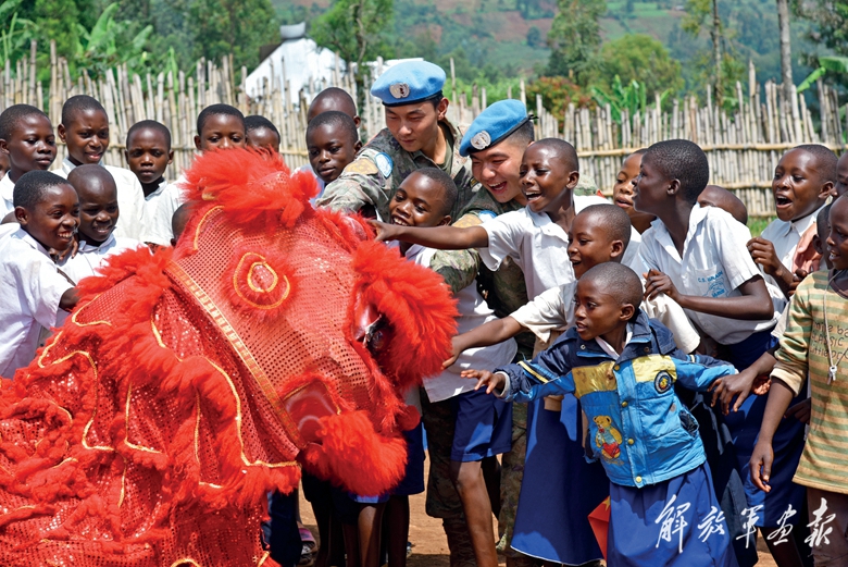 我維和官兵與當(dāng)?shù)貎和?lián)歡,進(jìn)行舞獅表演。(攝影/王樹虎)