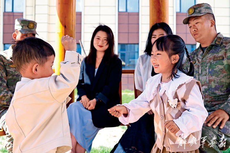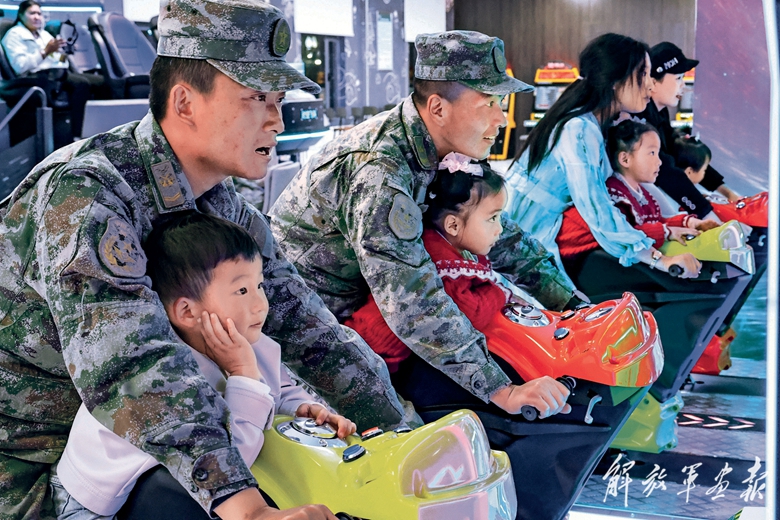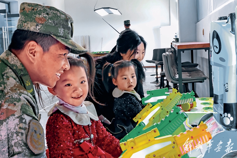 一級(jí)上士王俊杰夫婦陪同孩子在生活服務(wù)中心玩耍。