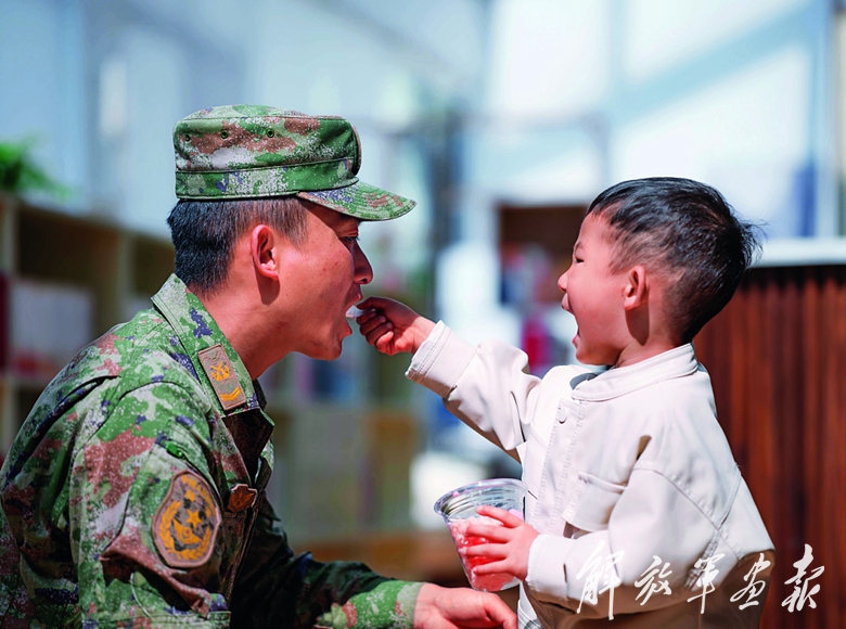 休閑娛樂室里,軍娃和爸爸在一起的溫馨時(shí)光。