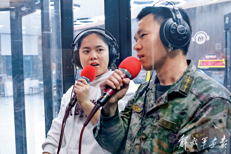 一對(duì)軍人夫婦在軍營(yíng)唱吧里深情對(duì)唱。