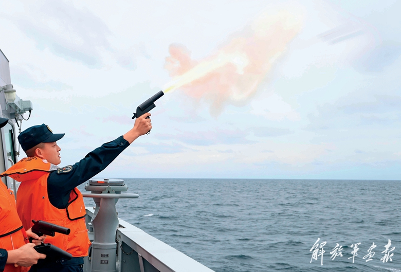 中越聯(lián)合巡邏艦艇編隊在北部灣海域開展聯(lián)合搜救訓(xùn)練,中方任務(wù)官兵發(fā)射信號彈。