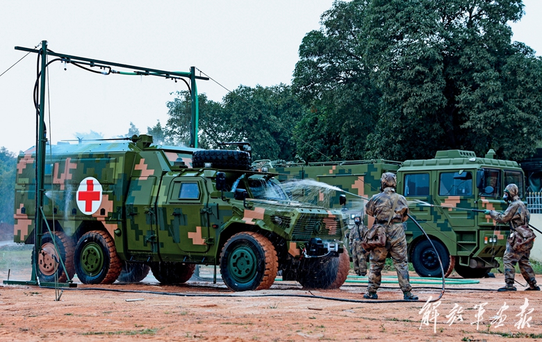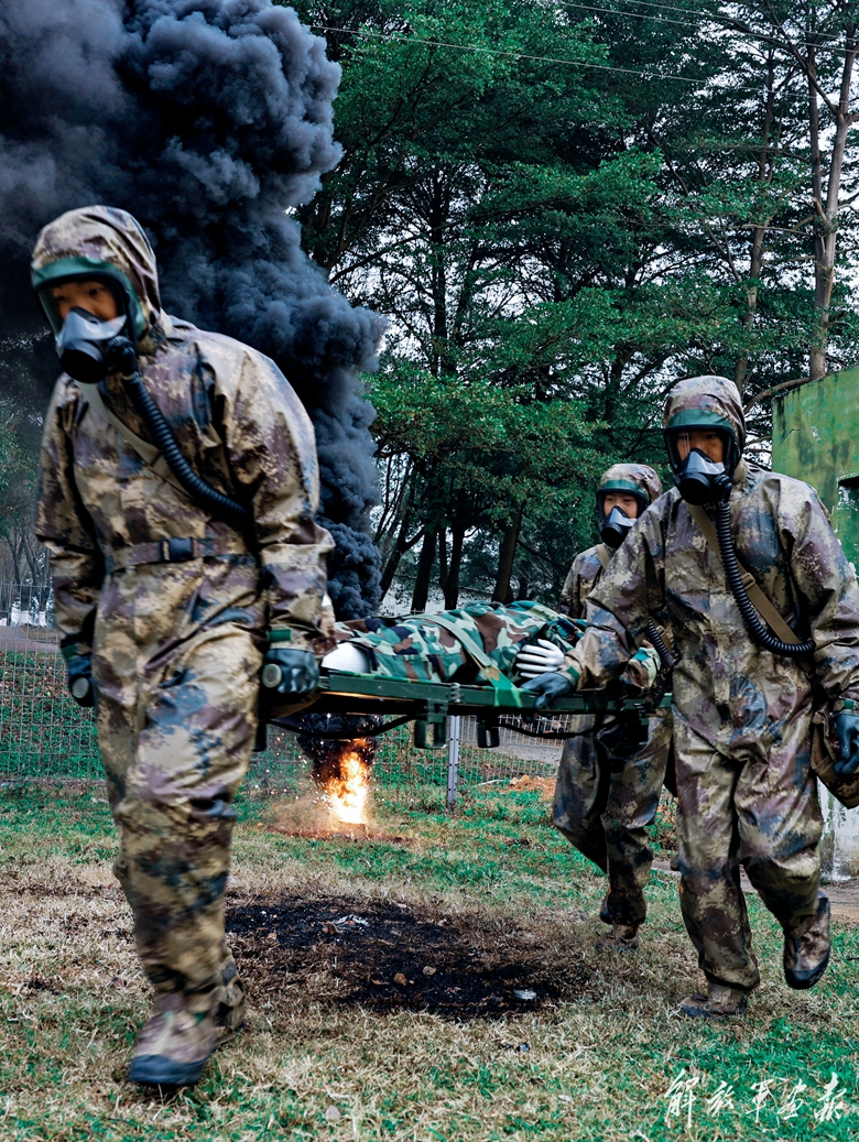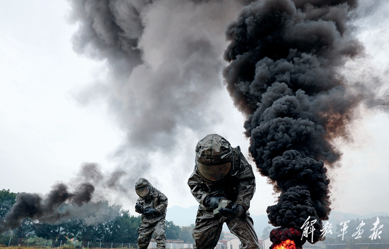訓練現(xiàn)場濃煙滾滾,兩名官兵穿戴重型防化服,手持檢測裝設備對核心受染區(qū)進行重點偵檢,確定化學成分后迅速撤離并上報指揮組。與此同時,救護組火速將“傷員”轉移至安全地域。受染區(qū)外,洗消組以最快速度搭建好臨時洗消區(qū)域,對離開沾染區(qū)的作業(yè)人員、裝備器材進行全面洗消,確保徹底消除可能附著的化學危險品……