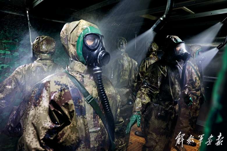 官兵進行毒劑偵檢作業(yè)。