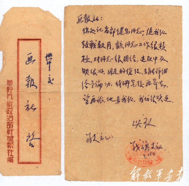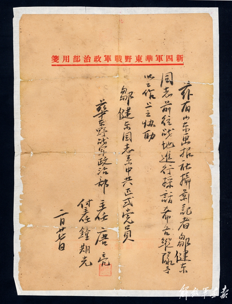 華東野戰(zhàn)軍政治部為鄒健東下部隊采訪開具的介紹信。