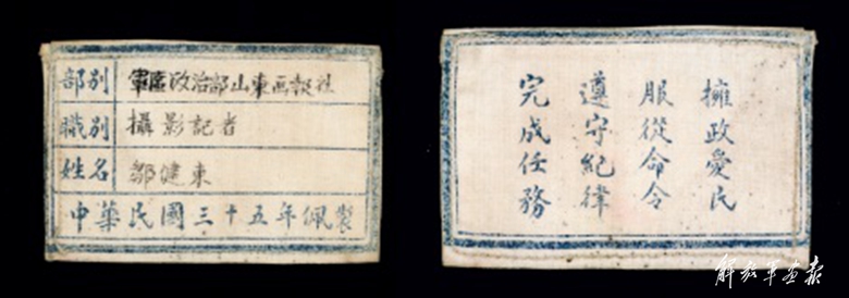 鄒健東當年佩戴的標志章“軍區(qū)政治部山東畫報社”。