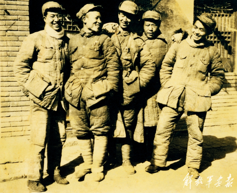 1947年2月23日,萊蕪大捷后,鄒健東(左三)與戰(zhàn)友王甸(左一)、郝世保(左二)、季音(左五)在周村宅院內(nèi)留影。