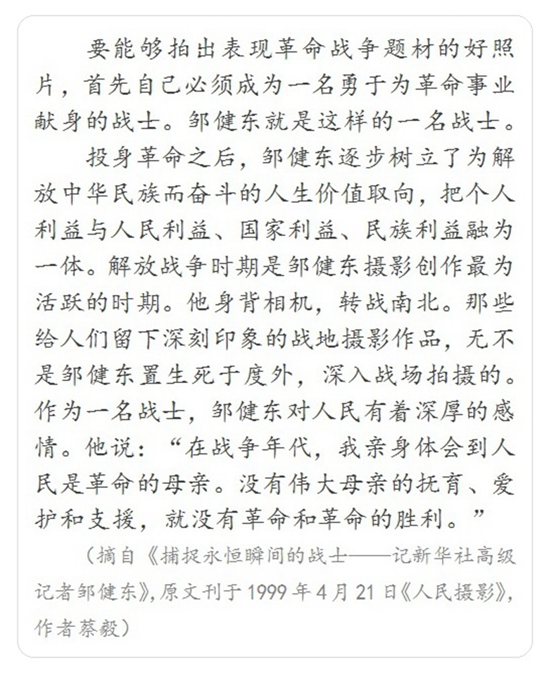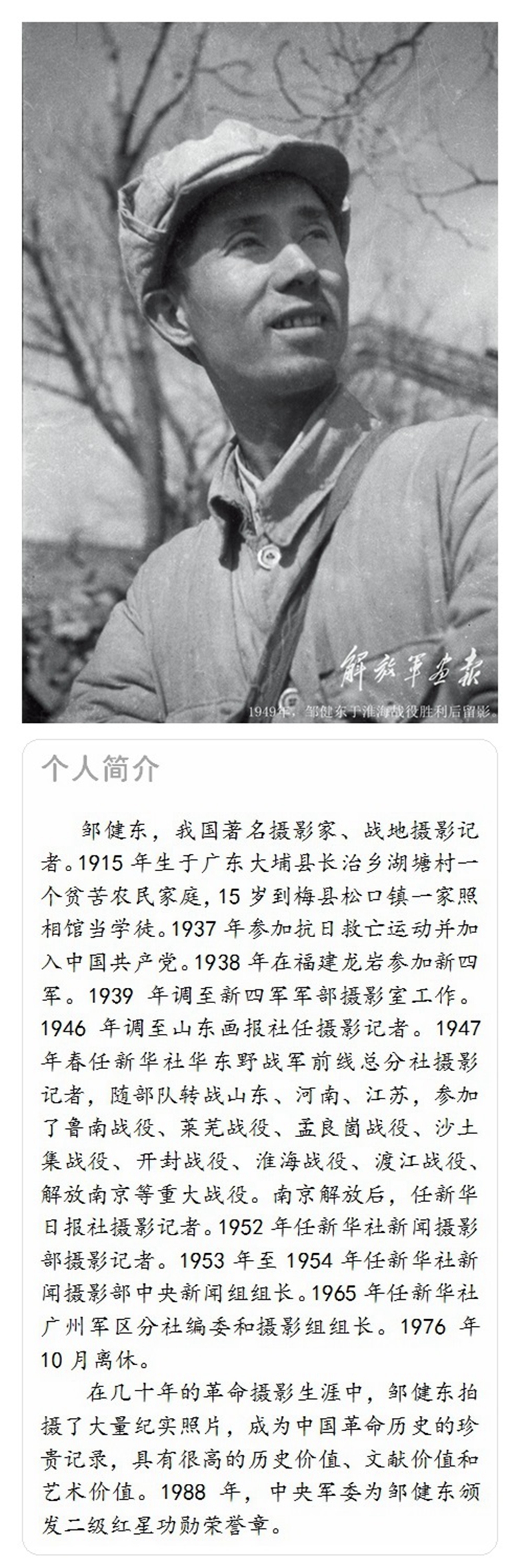 在鄒健東同志漫長的攝影生涯中,這部拍攝于解放戰(zhàn)爭時期的作品集只是他攝影藝術長卷的精彩開篇。戰(zhàn)爭年代,我軍的物質(zhì)條件十分匱乏,能夠提供給攝影記者的膠卷極少。鄒健東回憶說,當時他們不能放手拍攝,是因為還有很多后續(xù)的場面等著他們拍。在這樣的條件下,攝影記者敏銳的眼光和抓拍的本領顯得格外重要。他靠著對攝影事業(yè)的執(zhí)著追求,將生活與攝影創(chuàng)作的要求緊密聯(lián)系起來,“經(jīng)常在大腦中按動快門”,從而練就了過硬的攝影本領。新中國成立后,他先后在南京、北京、廣州等地從事攝影工作,又創(chuàng)作出大量優(yōu)秀作品。鄒健東同志及老一輩攝影工作者的歷史性貢獻將永遠被黨和人民銘記。