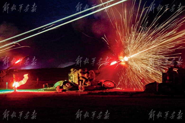 高炮分隊夜間對空射擊。