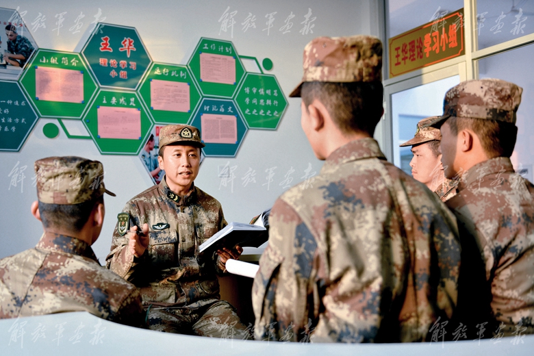 2019年,四級軍士長王華(左二)帶領(lǐng)理論小組成員學習政治理論。