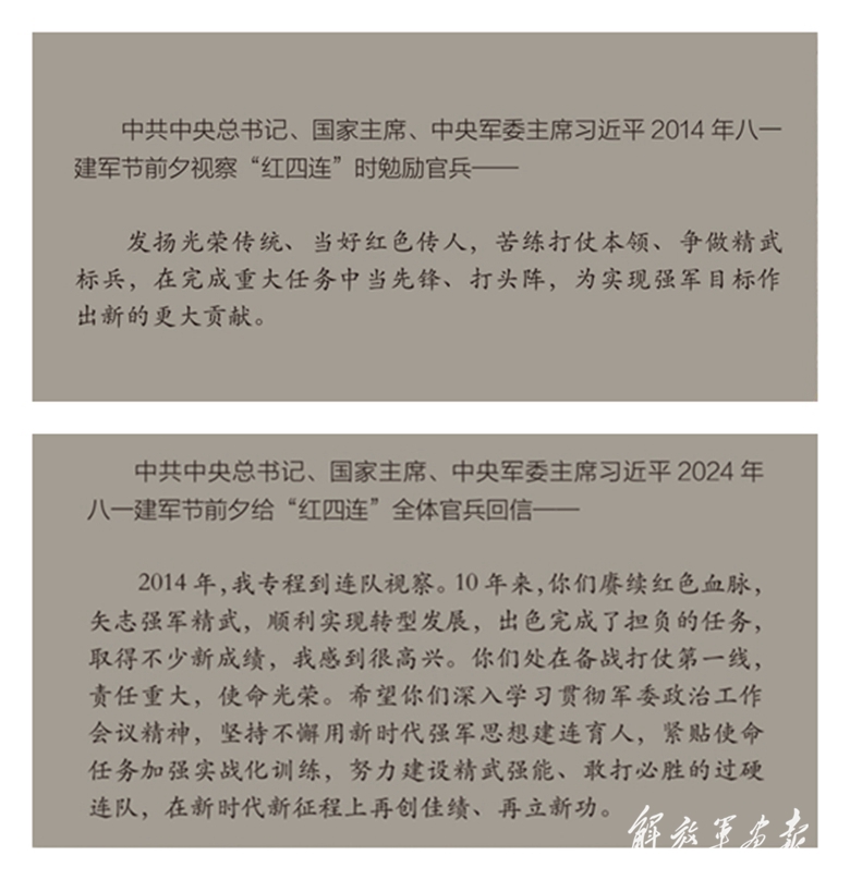 今年“八一”前夕,習主席給“強軍精武紅四連”全體官兵回信,對他們予以親切勉勵,并致以八一建軍節(jié)的問候。在回信中,習主席勉勵全連官兵努力建設精武強能、敢打必勝的過硬連隊,在新時代新征程上再創(chuàng)佳績、再立新功。
