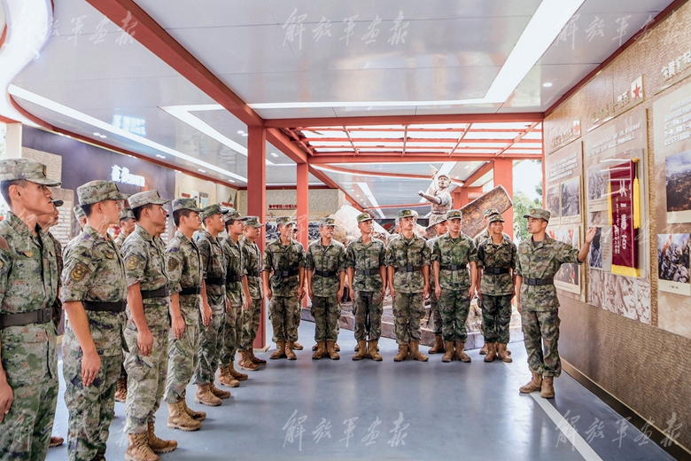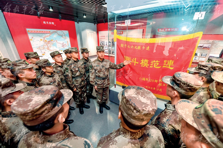 官兵在排榮譽柜前開展光榮傳統(tǒng)教育課。