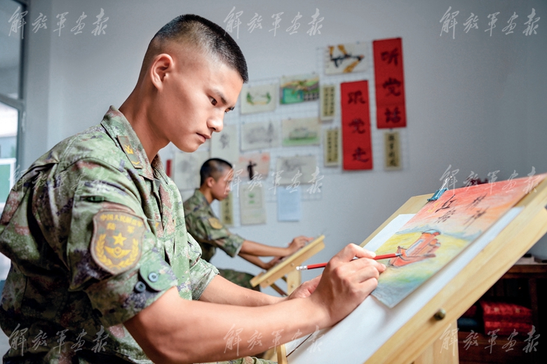 連隊開展紅色文化活動,戰(zhàn)士用繪畫形式表達對黨的深情。