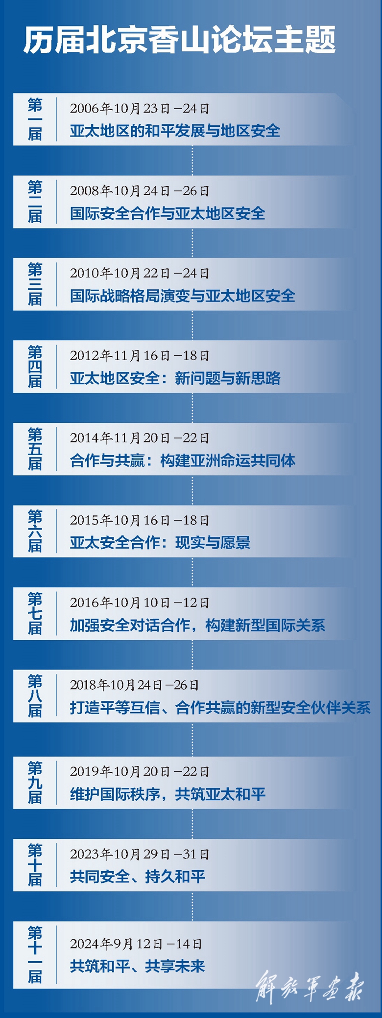 北京香山論壇自2006年創(chuàng)辦以來,始終秉持平等、開放、包容、互鑒精神,聚焦亞太地區(qū)乃至全球安全新形勢、新機遇、新挑戰(zhàn),倡導平等對話、合作互利、共同安全,致力于集聚智慧、擴大共識、增進互信,推動與各國防務機構、軍隊、國際組織和智庫專家的對話交流與合作,成為全球主要安全對話平臺之一。今年是和平共處五項原則發(fā)表70周年。在這一重要歷史節(jié)點上,本屆論壇確立“共筑和平、共享未來”主題,倡導以合作促發(fā)展、以合作促安全,為有效維護世界和平安寧凝聚智慧力量,為推動全球安全倡議落地見效提供理念指引,為推動構建人類命運共同體搭建重要平臺。
