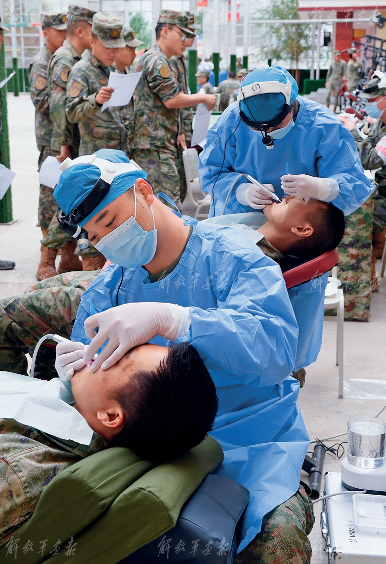 口腔科醫(yī)生為官兵治療牙齒疾病。