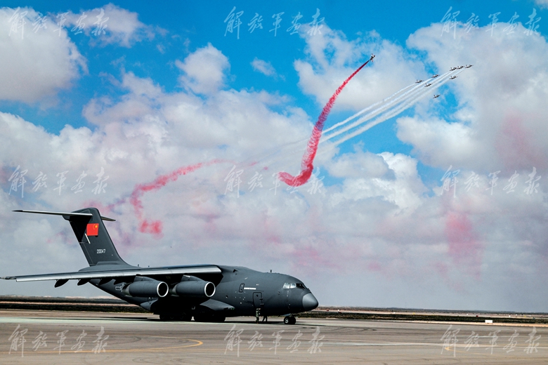 中國空軍運-20和八一飛行表演隊殲-10表演機同框。