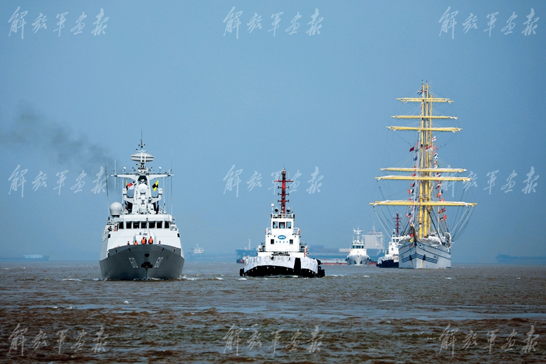 中方官兵列隊歡迎印度尼西亞海軍“畢瑪蘇吉”號風帆訓練艦訪滬。