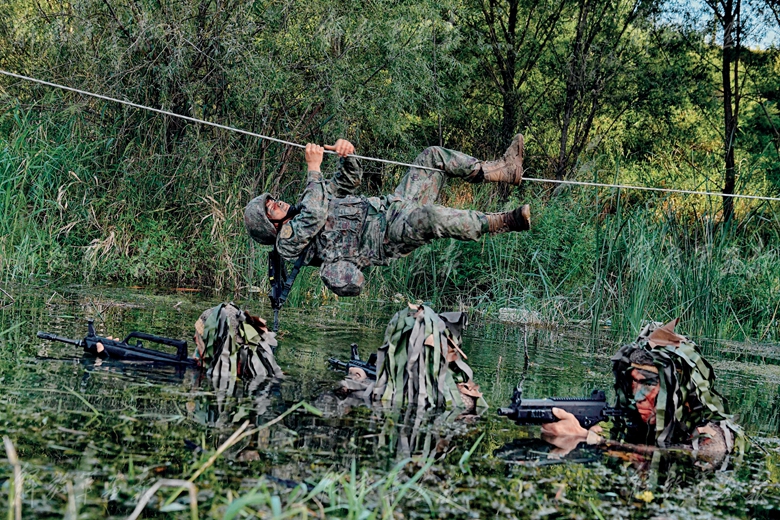 偵察隊員穿過密林,一條湍急的河流橫亙在眼前,阻擋了他們前進的腳步?!皽?zhǔn)備繩索!”指揮員現(xiàn)地研判后,當(dāng)即決定采取牽引橫越的方式渡河。經(jīng)過數(shù)個小時滲透,隊員們成功抵達目標(biāo)地域。