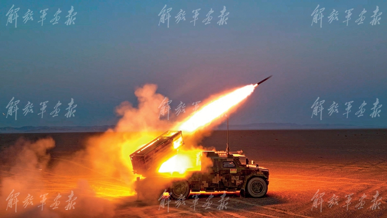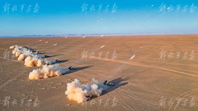 接收到指令后,火箭炮和榴炮分隊快速裝定諸元、準(zhǔn)備彈藥,對目標(biāo)實施火力打擊?!胺?!”隨著陣地指揮員一聲令下,陣地上飛沙四起、火光沖天,一條條火舌噴射而出,直擊目標(biāo)。