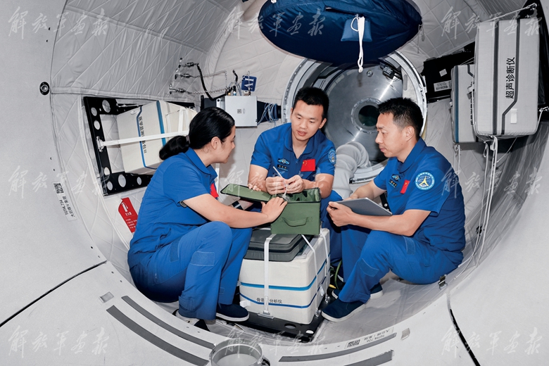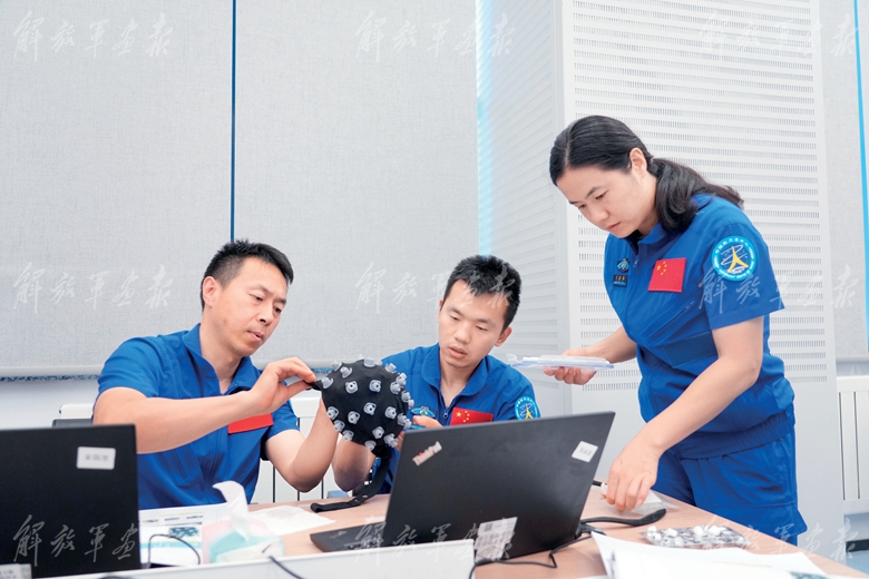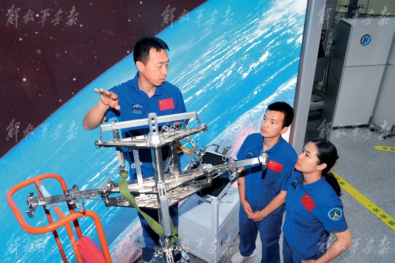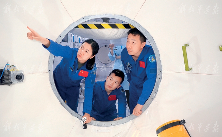 神舟十九號(hào)航天員乘組(從左至右:王浩澤、宋令東、蔡旭哲)進(jìn)行核心艙操作訓(xùn)練。(攝影/徐 部)