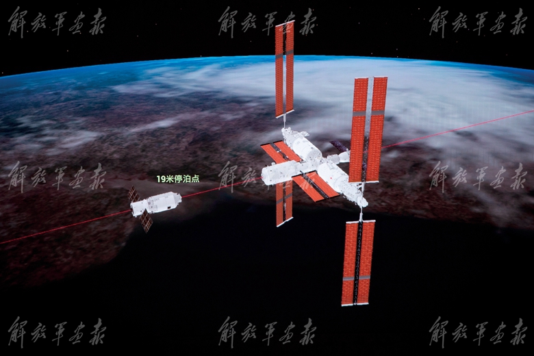 11月16日在北京航天飛行控制中心拍攝的天舟八號貨運飛船與空間站組合體完成交會對接的畫面。(攝影/韓啟揚)