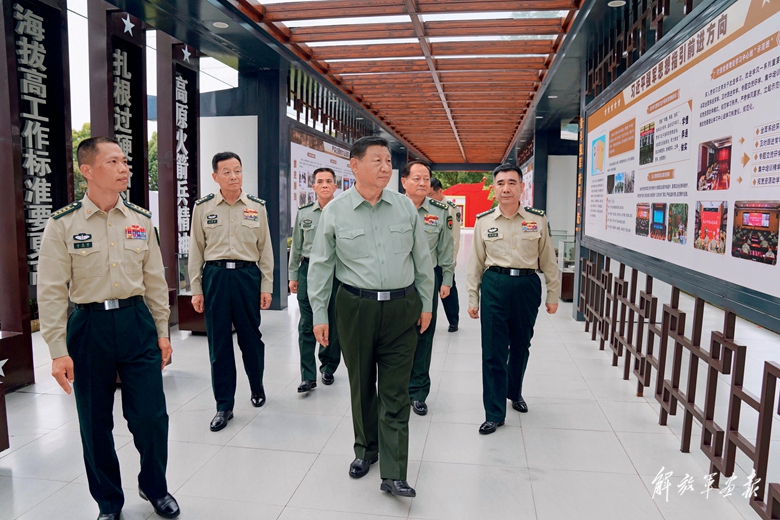 金秋十月,江淮大地山水秀麗、風(fēng)景如畫。上午11時許,習(xí)近平來到火箭軍某旅,首先察看了該旅軍史長廊。該旅是一支有著50多年光榮歷史的戰(zhàn)略導(dǎo)彈部隊。黨的十八大以來,該旅在習(xí)近平強(qiáng)軍思想指引下,堅定舉旗鑄魂,大抓實戰(zhàn)化訓(xùn)練,出色完成一系列重大任務(wù)。在反映部隊發(fā)展歷程、新時代全面建設(shè)的展板前,習(xí)近平詳細(xì)了解官兵學(xué)習(xí)黨的創(chuàng)新理論、加緊練兵備戰(zhàn)、弘揚優(yōu)良傳統(tǒng)等情況。