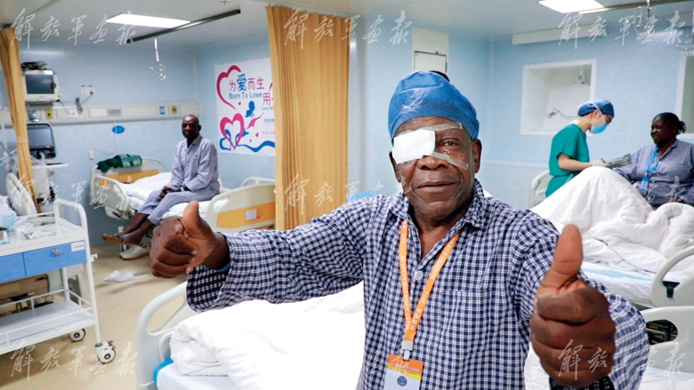 姆福圖在和平方舟醫(yī)院船實施右眼白內(nèi)障復(fù)明術(shù)后,感激地向醫(yī)護(hù)人員豎起大拇指。
