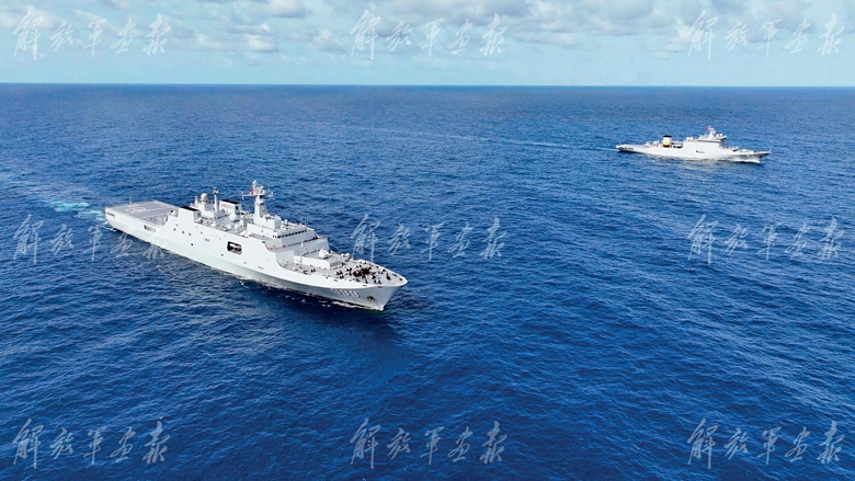 中國海軍戚繼光艦(右)、井岡山艦(左)在太平洋上航行。