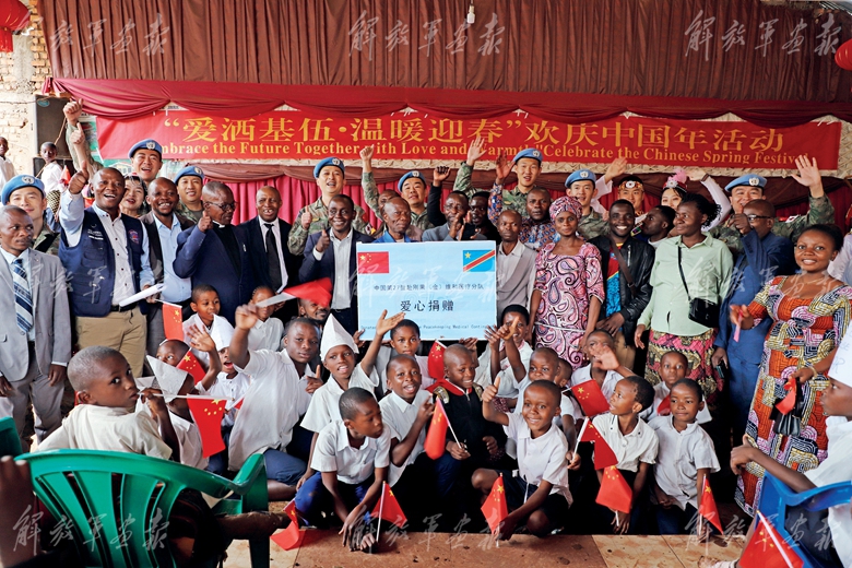 2月13日,中國(guó)第27批赴剛果(金)維和部隊(duì)官兵來(lái)到駐地穆塔姆巴拉公立學(xué)校,與當(dāng)?shù)貛熒黄饸g度中國(guó)年。(攝影/胥艷梅)