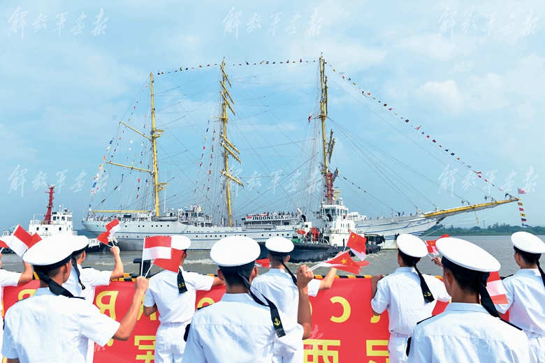 9月6日至10日,印度尼西亞海軍“畢瑪蘇吉”號(hào)風(fēng)帆訓(xùn)練艦,對(duì)上海進(jìn)行友好訪問(wèn)。圖為9月6日,中方官兵列隊(duì)歡迎“畢瑪蘇吉”號(hào)風(fēng)帆訓(xùn)練艦到訪。(攝影/耿海鵬)