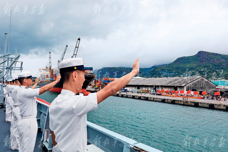 當(dāng)?shù)貢r(shí)間4月18日,中國(guó)海軍第45批護(hù)航編隊(duì)抵達(dá)塞舌爾,官兵向歡迎民眾揮手致意。(攝影/周建龍)