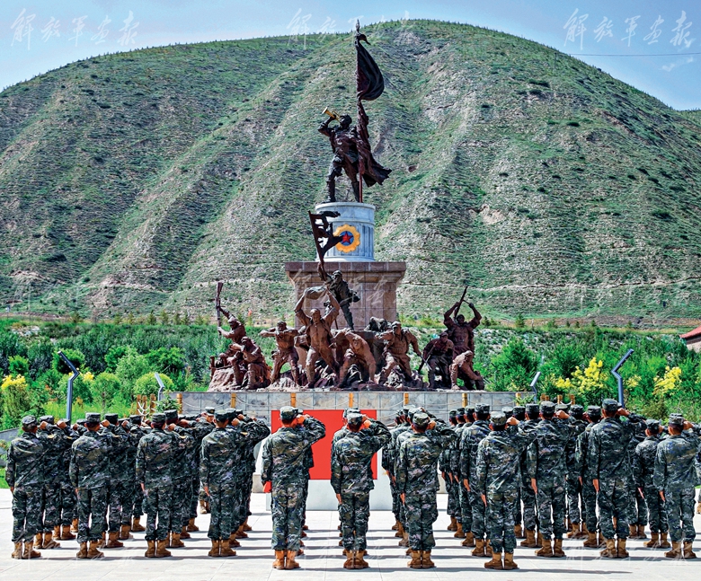 7月9日,武警甘肅總隊(duì)某支隊(duì)組織官兵參觀紅軍西路軍古浪戰(zhàn)役紀(jì)念館。圖為官兵在西路軍將士雕像前開(kāi)展宣誓活動(dòng)。(攝影/陳星宇)