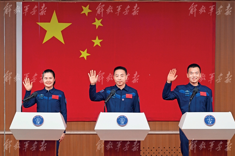 10月29日,神舟十九號(hào)載人飛行任務(wù)航天員蔡旭哲(中)、宋令東(右)、王浩澤在酒泉衛(wèi)星發(fā)射中心問(wèn)天閣與媒體記者集體見(jiàn)面。(攝影/汪江波)