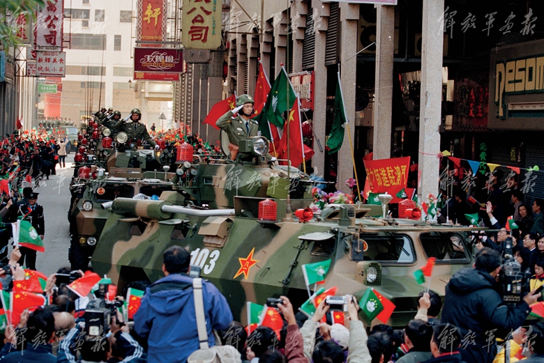 1999年12月20日,中國(guó)政府恢復(fù)對(duì)澳門(mén)行使主權(quán)。圖為中國(guó)人民解放軍進(jìn)駐澳門(mén),受到澳門(mén)各界人士的熱烈歡迎。(攝影/賈明祖)