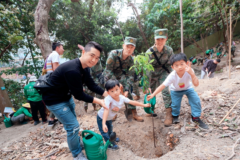 駐澳門(mén)部隊(duì)積極開(kāi)展義務(wù)植樹(shù)活動(dòng)。圖為2023年3月18日,官兵同一起參加義務(wù)植樹(shù)的澳門(mén)市民合影。