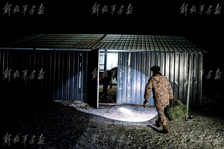 軍馬飼養(yǎng)員為戰(zhàn)友巡邏備馬。