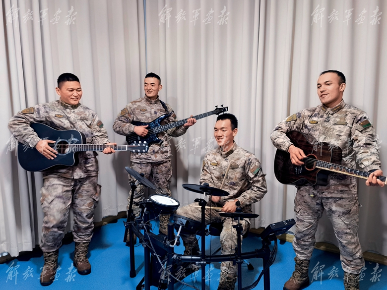連隊“雪絨樂隊”成員利用休息時間排練歌曲。