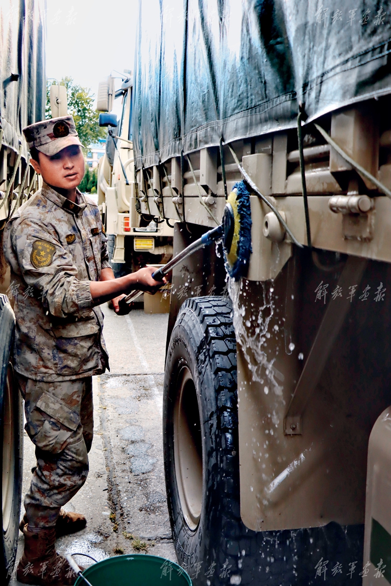 任務結(jié)束后,鐘棉進擦拭保養(yǎng)汽車。