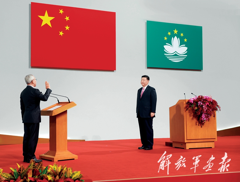 在熱烈的掌聲中,習(xí)近平發(fā)表了重要講話。他首先代表中央政府和全國各族人民,向全體澳門居民致以誠摯問候;向新就任的澳門特別行政區(qū)第六任行政長官岑浩輝先生和第六屆政府主要官員、行政會委員,表示熱烈祝賀;向長期關(guān)心支持“一國兩制”事業(yè)和澳門繁榮穩(wěn)定發(fā)展的海內(nèi)外同胞和國際友人,表示衷心感謝。