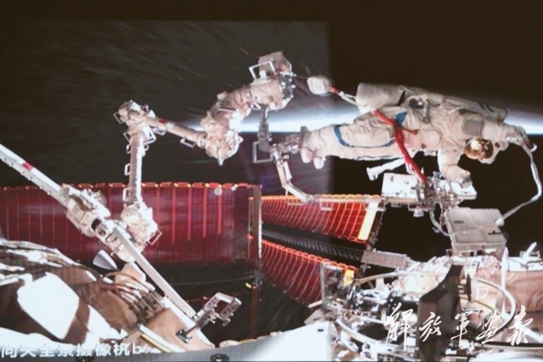1月20日在北京航天飛行控制中心拍攝的神舟十九號(hào)航天員宋令東在空間站組合體艙外工作的畫(huà)面。(攝影/新華社記者 劉 芳)
