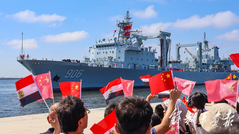 當(dāng)?shù)貢r(shí)間2024年8月15日,中國海軍第46批護(hù)航編隊(duì)抵達(dá)埃及亞歷山大港,碼頭歡迎人群揮舞兩國國旗迎接。(攝影/張大禹)