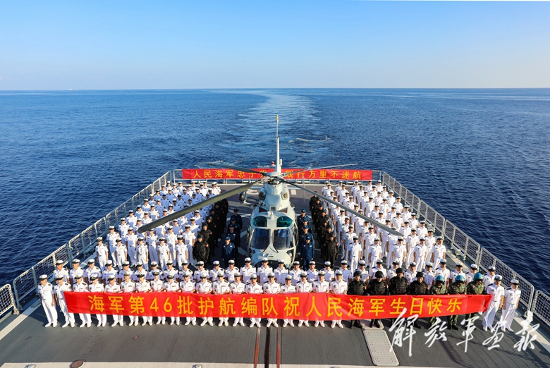 2024年4月,海軍第46批護(hù)航編隊(duì)官兵在浩瀚大洋上為人民海軍成立75周年送上祝福。(攝影/梁 磊)