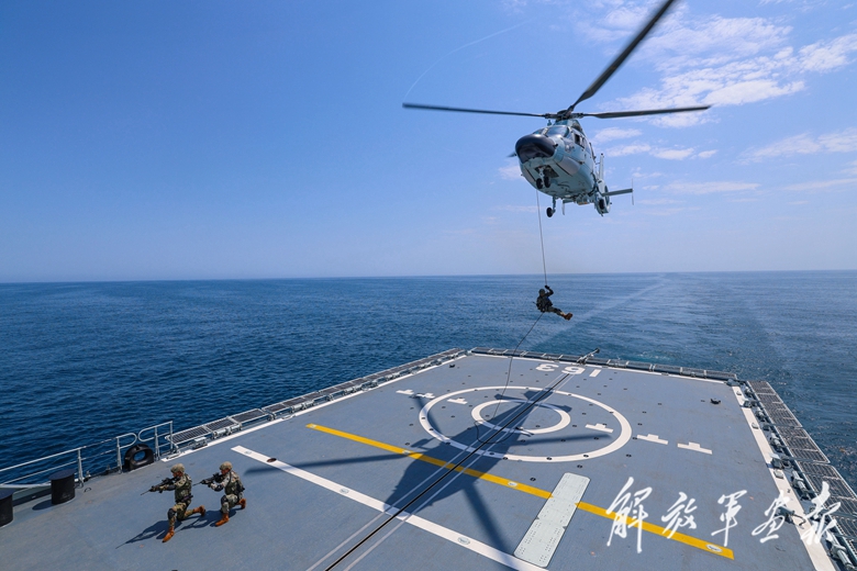 2024年10月,中國海軍第46批護(hù)航編隊(duì)隨艦特戰(zhàn)隊(duì)員開展索降登船訓(xùn)練。(攝影/梁 磊)