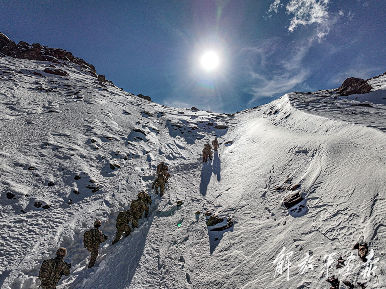 春節(jié)前夕,西藏日喀則軍分區(qū)某部官兵在冰峰雪谷間巡邏執(zhí)勤。(攝影/王 乾)