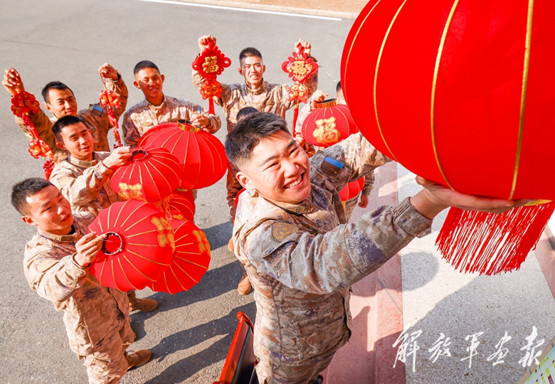 春節(jié)前夕,空降兵某旅戰(zhàn)士懸掛燈籠,營(yíng)造節(jié)日氛圍。(攝影/謝程宇)