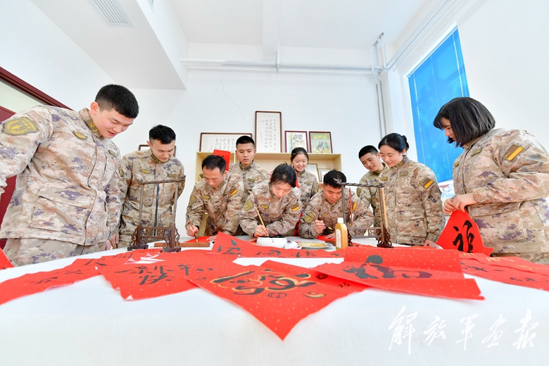 春節(jié)前夕,火箭軍某部官兵書寫春聯(lián)。(攝影/陳世鋒)