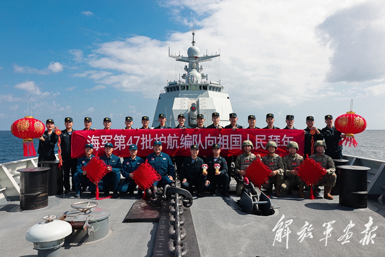 中國(guó)海軍第47批護(hù)航編隊(duì)在亞丁灣海域向祖國(guó)人民拜年。(攝影/任 科)