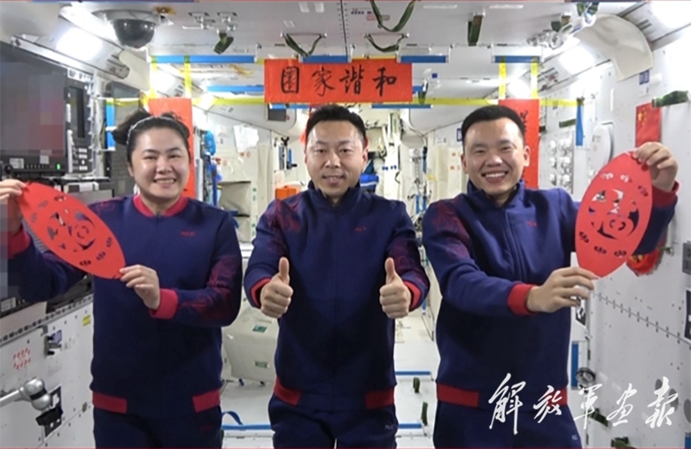春節(jié)前夕,神舟十九號(hào)航天員乘組在中國(guó)空間站向全國(guó)人民拜年。(新華社發(fā))