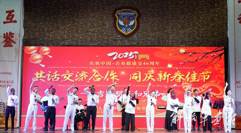 當(dāng)?shù)貢r(shí)間1月23日晚,我駐吉布提保障基地舉辦春節(jié)文化交流活動(dòng)。圖為中吉青年合唱《友誼地久天長(zhǎng)》。(攝影/沈 奧)