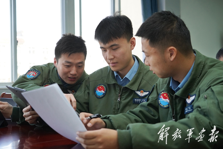 訓(xùn)練前,飛行員討論訓(xùn)練方案。